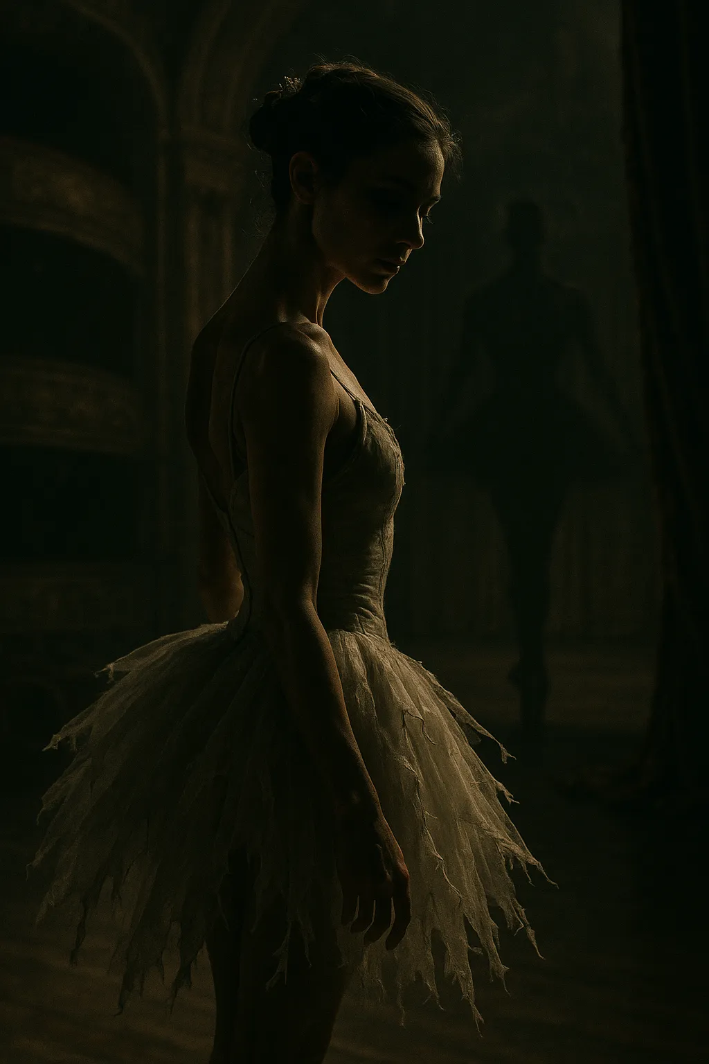 The dressing room was cold. Someone had left the window cracked and the October air had gotten into everything — the tulle hanging on the rack, the towels, the jar of cold cream with its lid off. Elara shut the window and sat at the vanity.